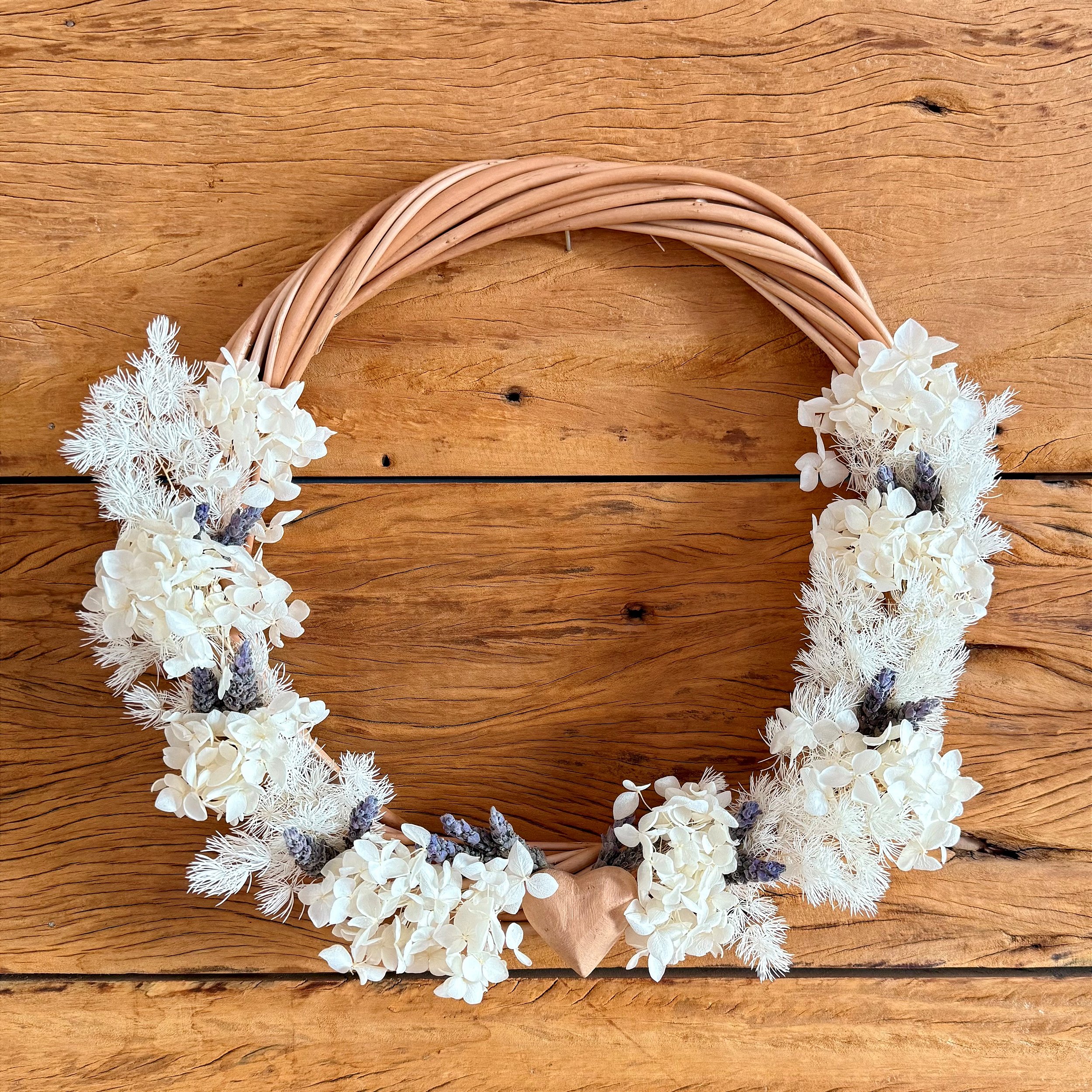 Guirlanda trançada de vime, aspargo natural preservado, hortênsia preservada e lavanda dentata natural desidratada. O coração de madeira dá um charme todo especial nesta peça única.